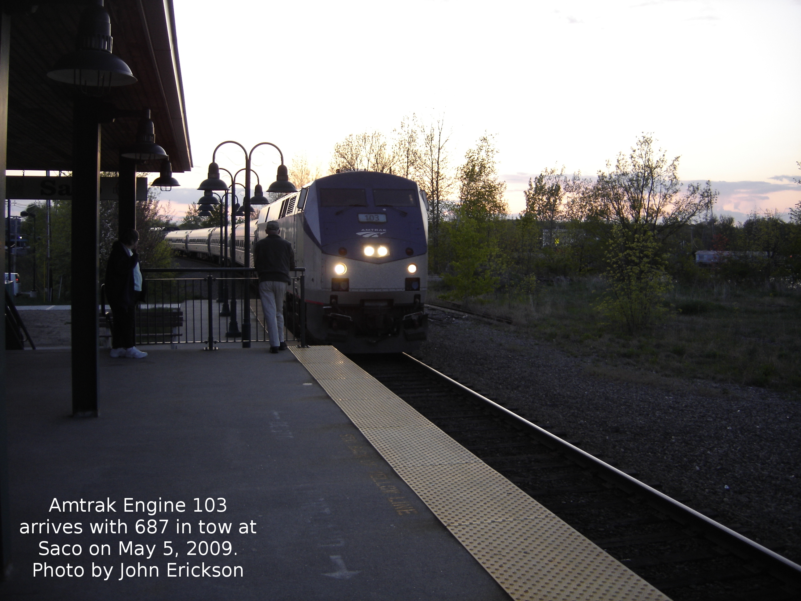 Amtrak Engine 103 arrives with 687 in tow at Saco on May 5, 2009.