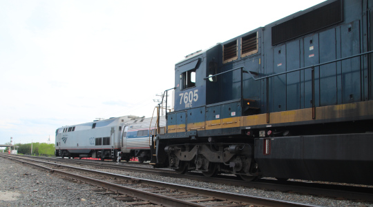 MEC 7605 meets Amtrak 122 and Downeaster 688 at Mountain Junction on May 18th of 2021.