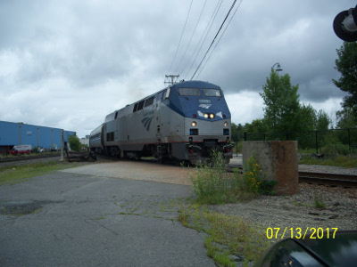 Amtrak 123 at Exeter with 693 on July 22, 2017.