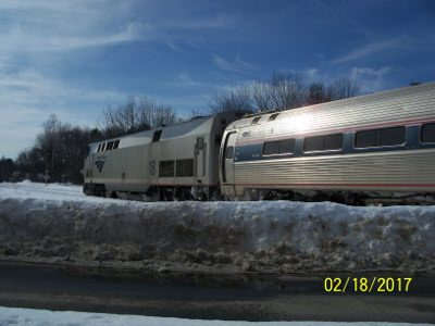 AMTK 18 flies 691 northbound through Yarmouth Junction on February 18th of 2017.