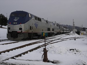 Amtrak Engines 93 & 197 depart with the Downeaster 686 from Portland on January 25, 2006.
