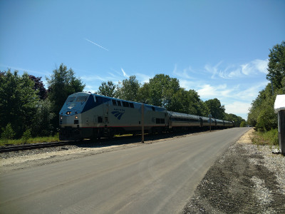 AMTK 46 with Downeaster 691 at Yarmouth Junction in Yarmouth on July 21st of 2018.