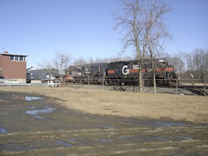 B&M 342 takes the wreck train westbound by the Fairgrounds in Lewiston on the 6th of March, 2006.