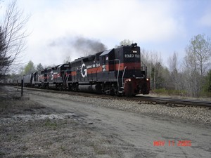 MEC 347, 377, 517, & 379, & ST 621 pull out of the siding at New Glouster with POWA on April 11th of 2005.