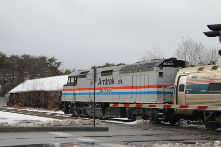Amtrak 206, 90214, 683 and 5 cars pass Stanwood Street on January 23rd of 2017.
