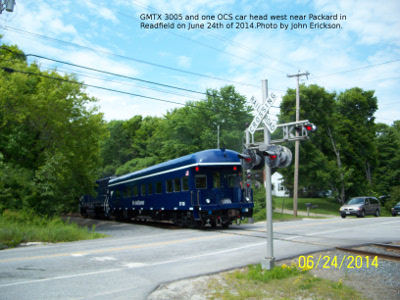 GMTX 3005 with one OCS passenger car at Packard in Readfield on June 24th of 2014.