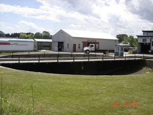 The Rockland Engine House is a five-bay wooden frame engine house with a concrete foundation and a steel turntable with wooden decking. Both were built in 1921 by the Maine Central to replace an earlier set and are still in use today.