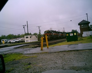 MEC 347, 377, 517, & 379, & ST 621 pull out of the siding at New Glouster with POWA on April 11th of 2005.