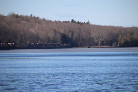 CSXT 7774 and 7799 take L070 past Maranacook Lake in Monmouth on March 27th of 2025.