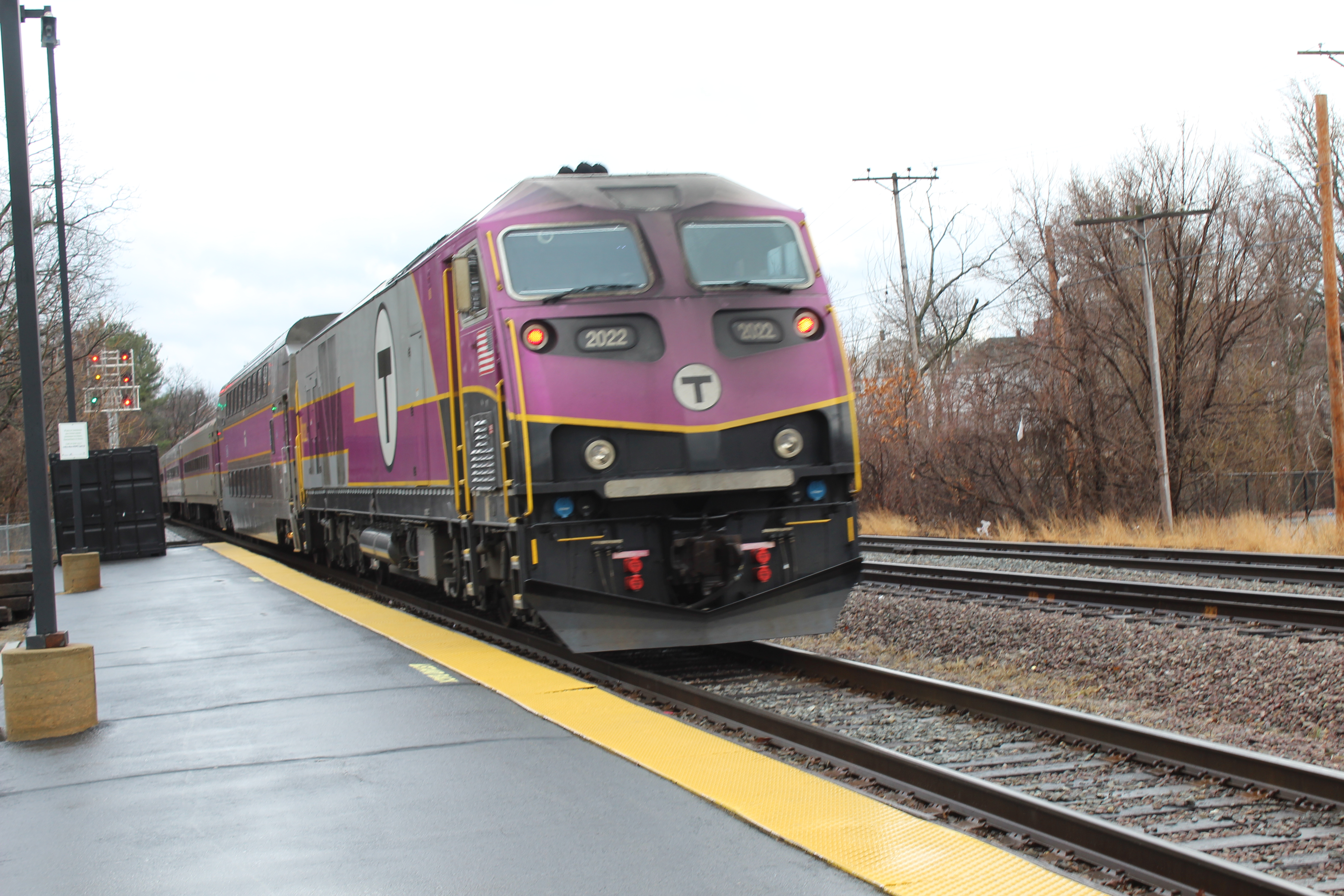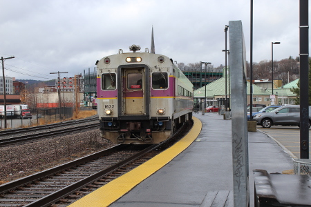 MBTA engine 2022 pushes train 420 out of Fitchburg on March 13th of 2020.