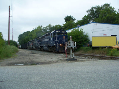 MEC 381, 383, & 510 pull RUPO through Falmouth (CPF 192) in Portland on August 24th of 2019.