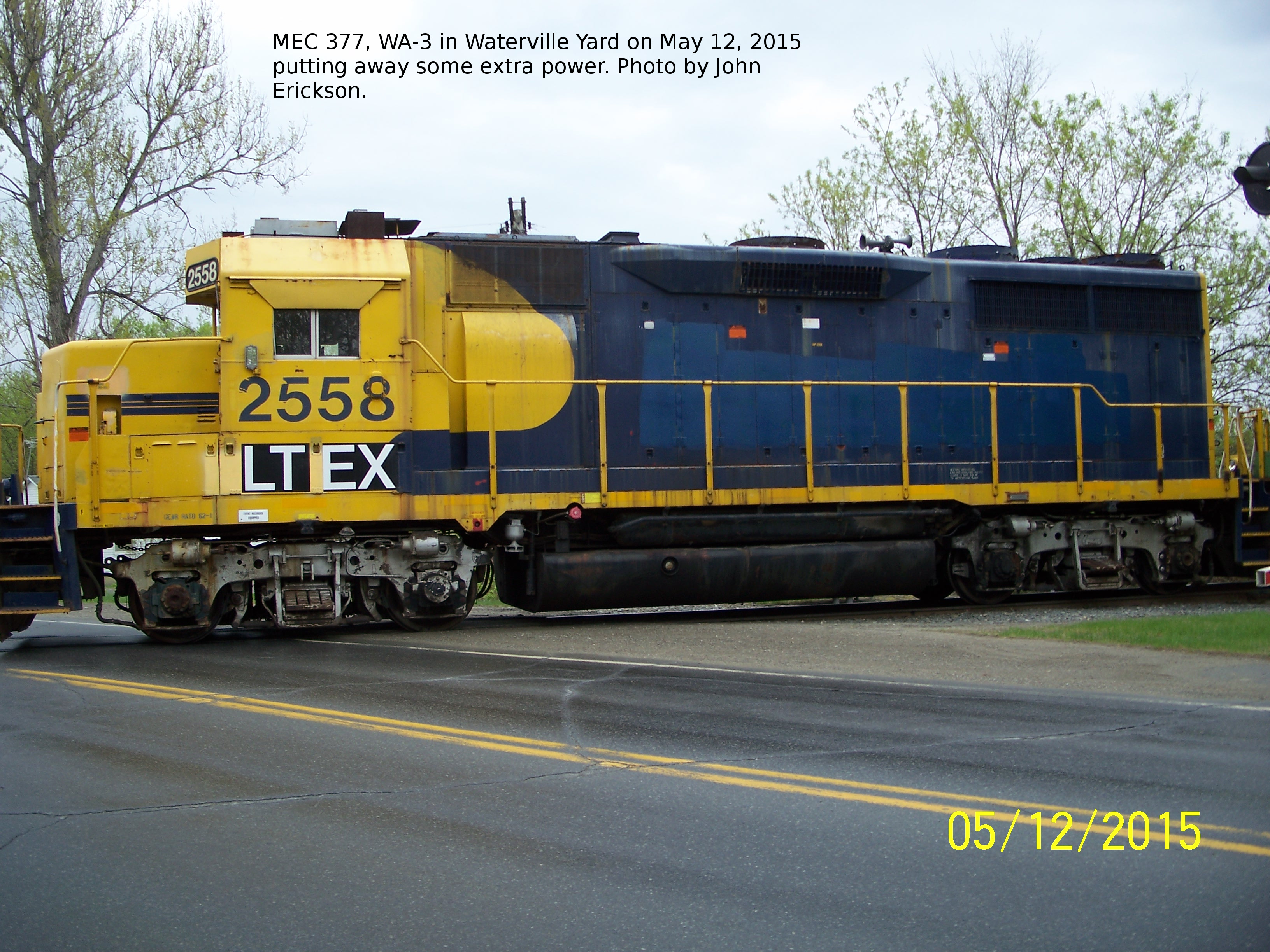MEC 377, WA-3 in Waterville Yard on May 12, 2015 putting away new arrivals. These engines have not shown up in service.